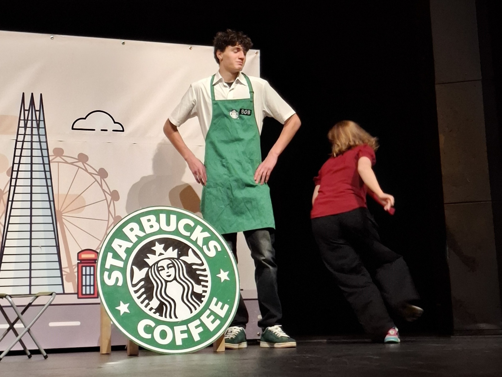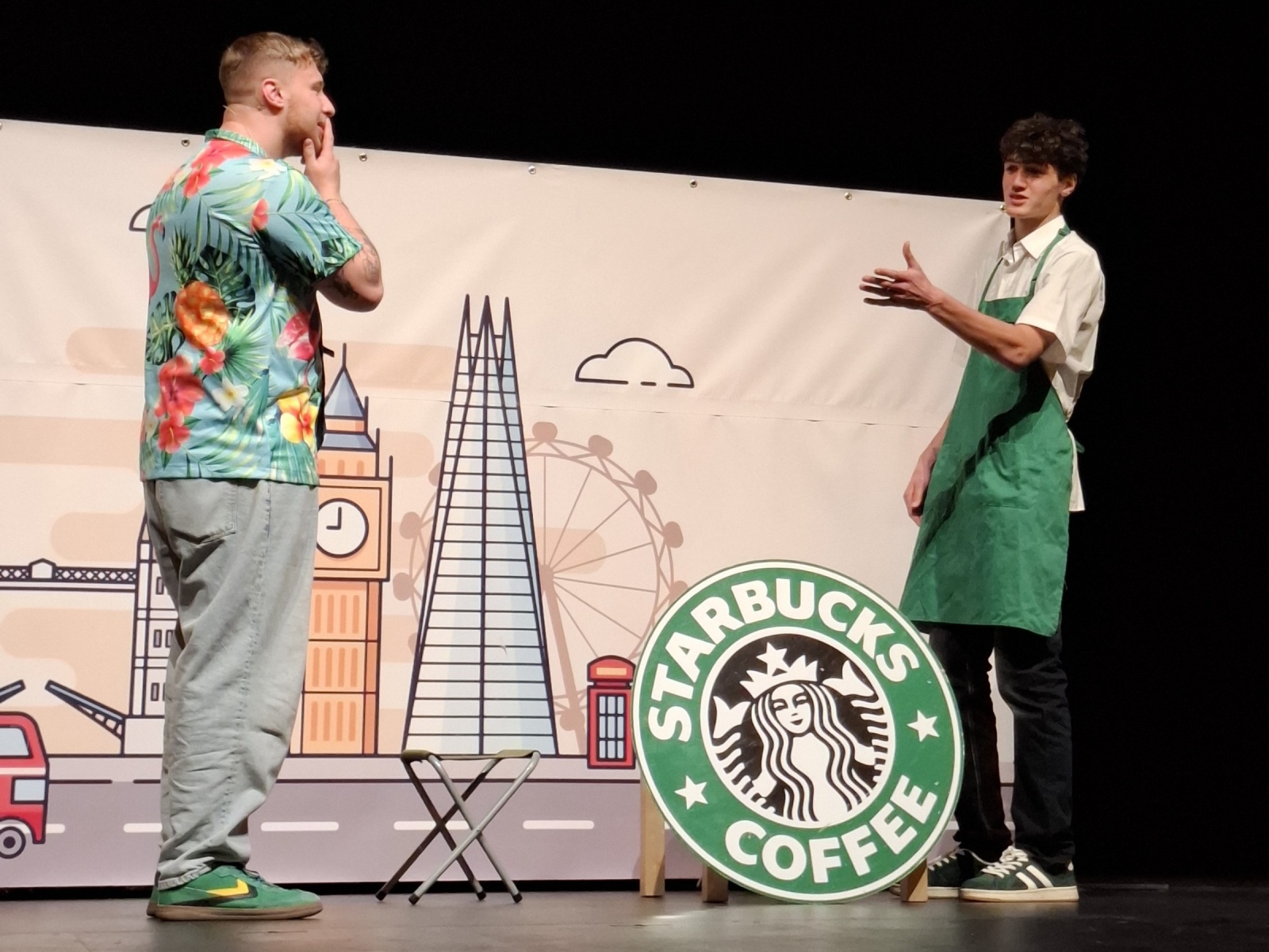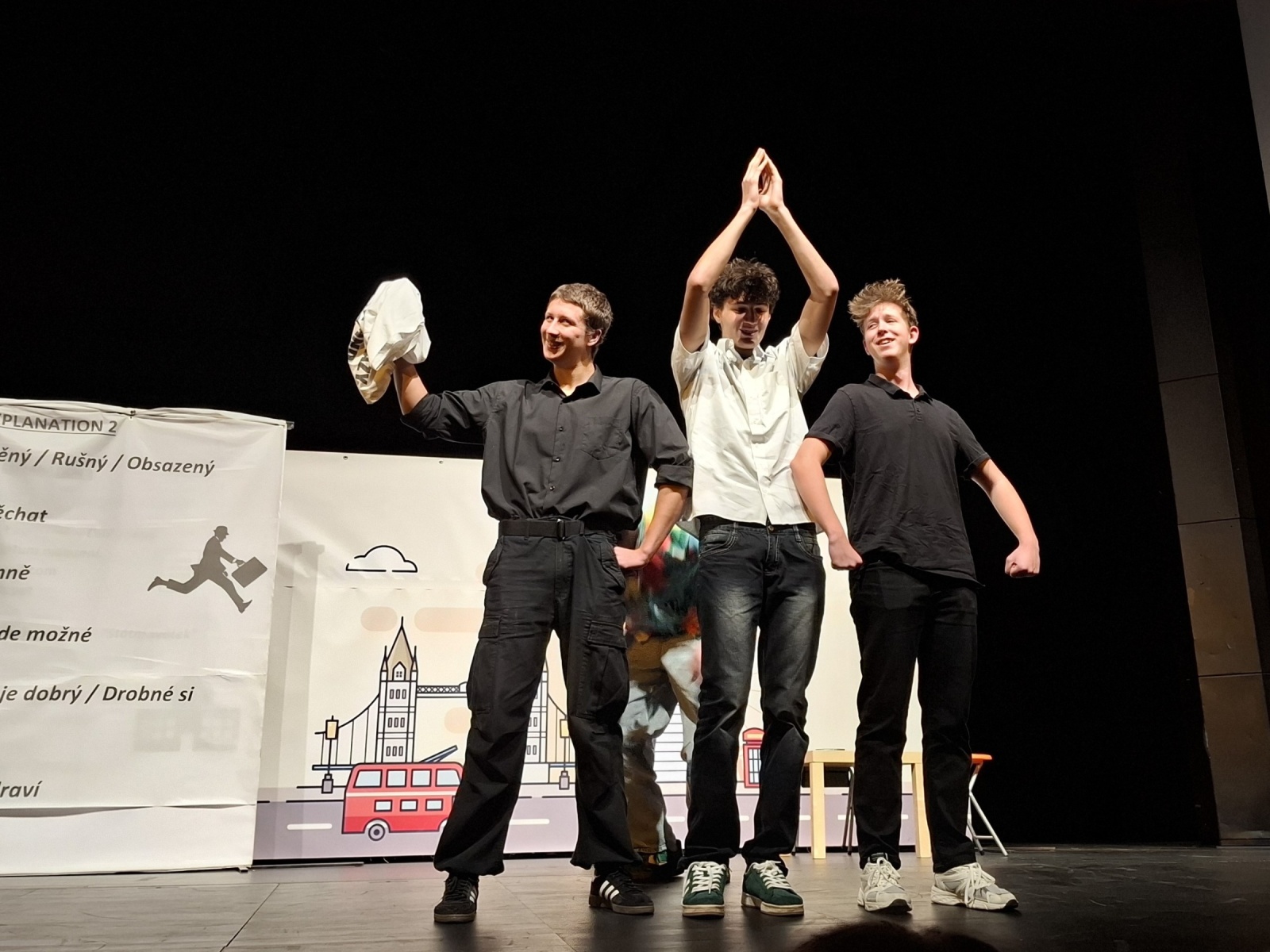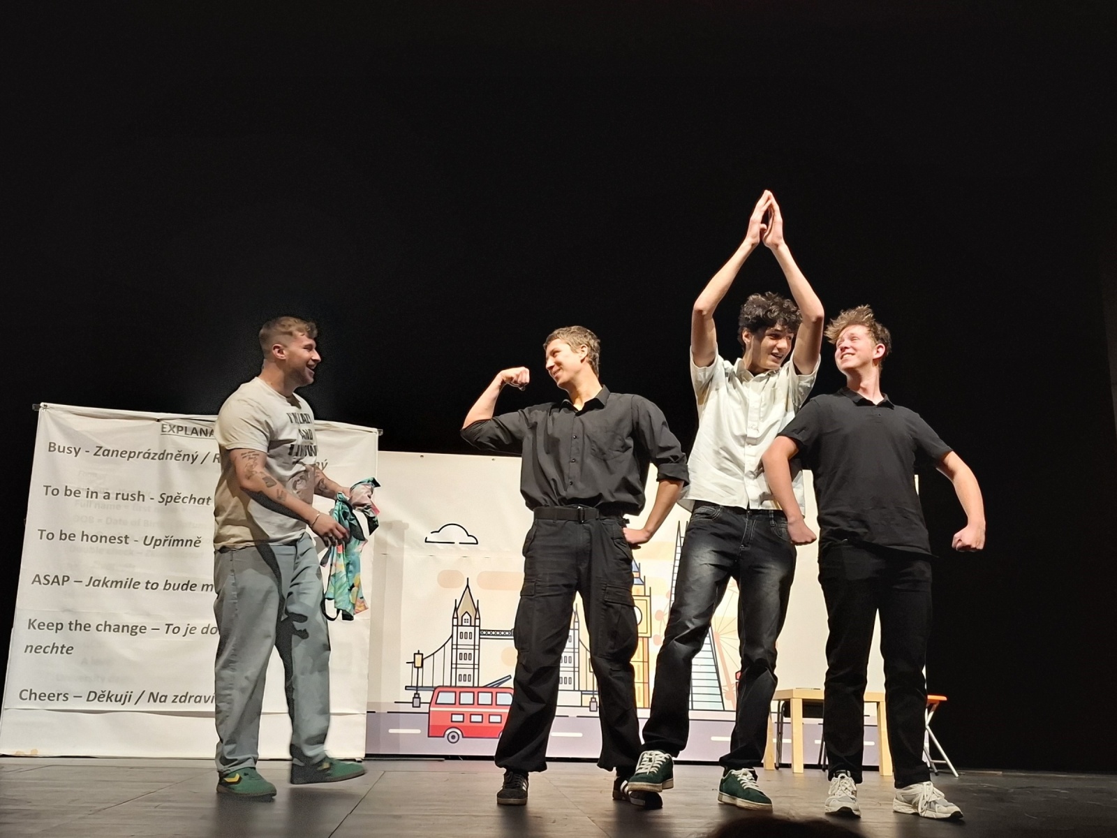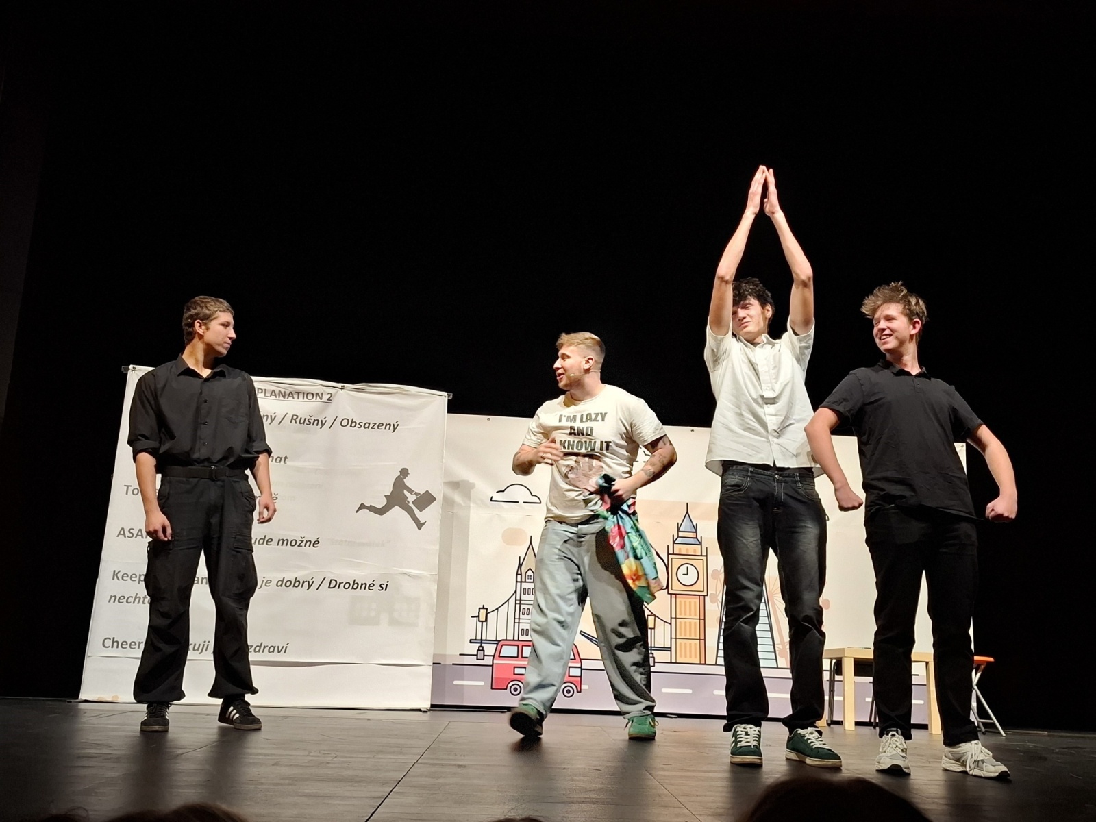 V pátek 14.11. 2025 zažili studenti z 9 studijních tříd anglické edukativní představení, ve kterém prožili jeden neobyčejný den s mladíkem Chrisem. Chris se během dne dostává do různých situací, které nabízí kontext pro užívání běžných anglických frází a vhodné slovní zásoby. Po každé scéně vystoupí hlavní aktéři představení z role a upřesňují správné použití gramatiky a jazykových prostředků publiku.