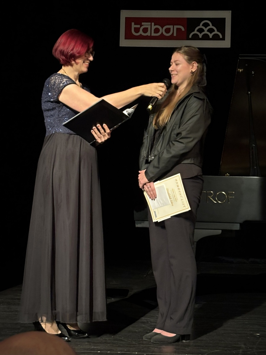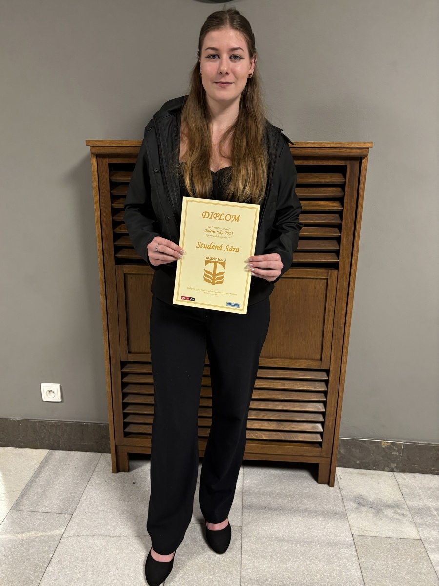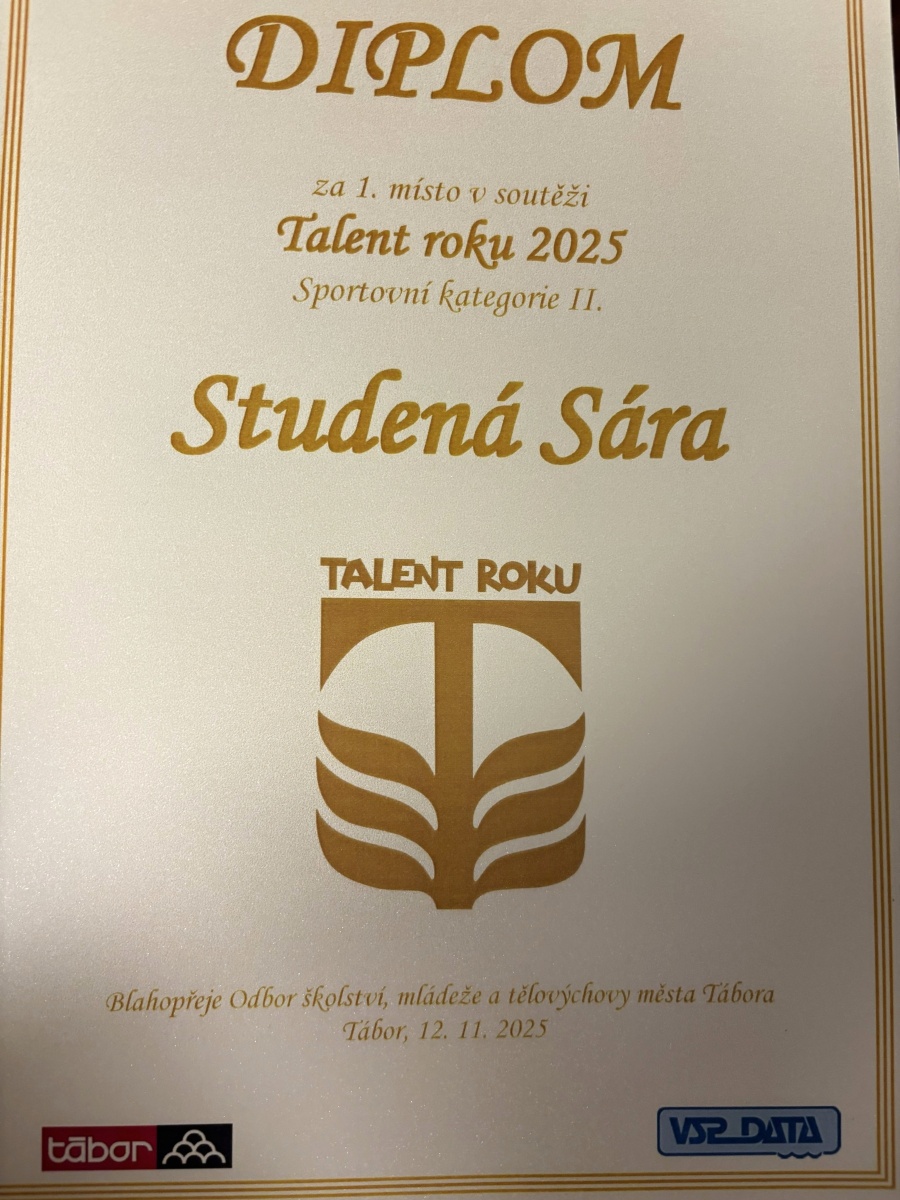 Naše škola nominovala Sáru Studenou, studentku čtvrtého ročníku Veřejnosprávní činnosti v oblasti sportovní. V kategorii II (studenti do ukončení střední školy) Sára vyhrála a získala titul Talent roku 2025.